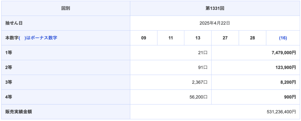 | 第1331回 2025年04月22日(火) | 09 11 13 27 28 (16) |