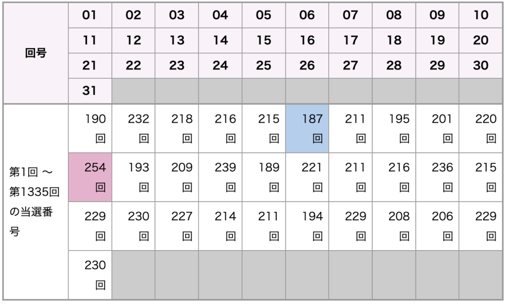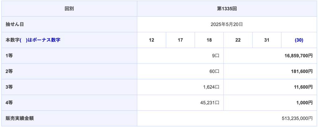 | 第1335回 2025年05月20日(火) | 12 17 18 22 31 (30) |