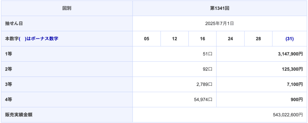 | 第1341回 2025年07月01日(火) | 05 12 16 24 28 (31) |