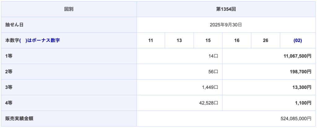 | 第1354回 2025年09月30日(火) | 11 13 15 16 26 (02) |