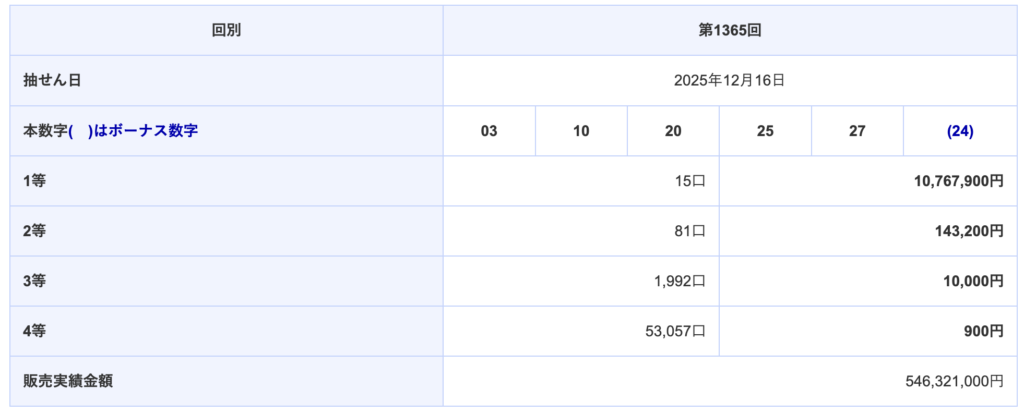 | 第1365回 2025年12月16日(火) | 03 10 20 25 27 (24) |
