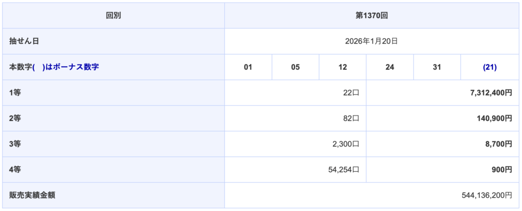 | 第1370回 2026年1月20日(火) | 01 05 12 24 31 (21) |