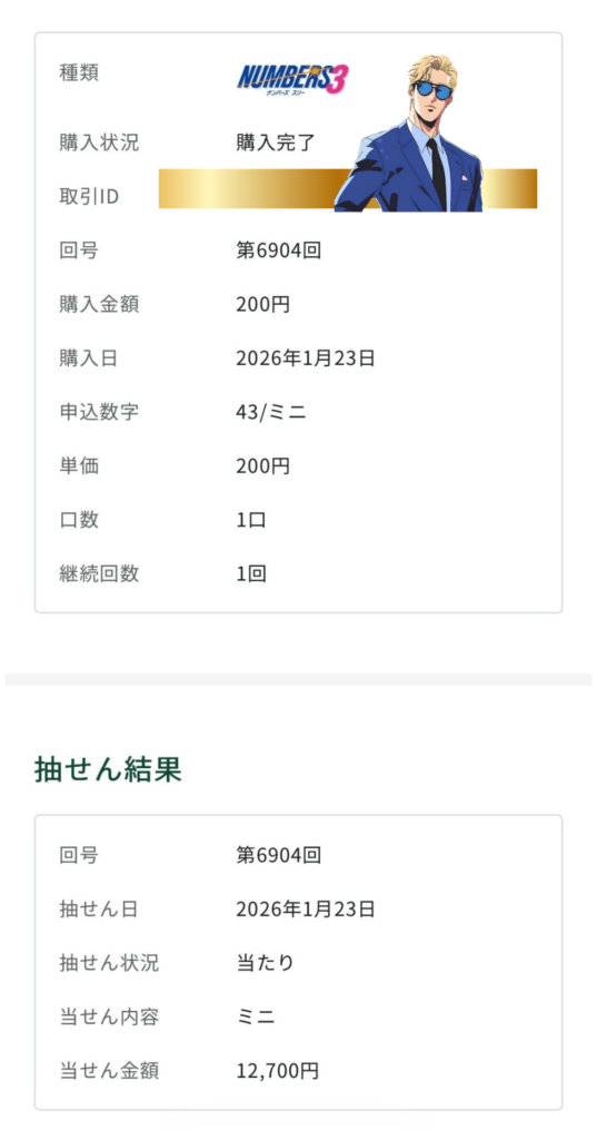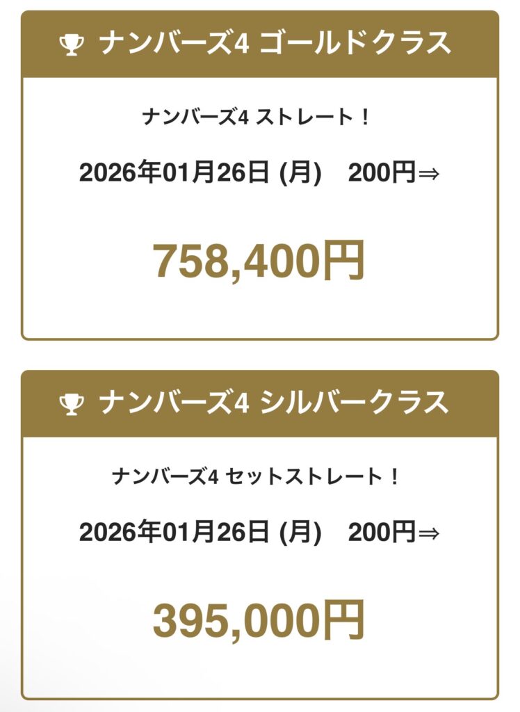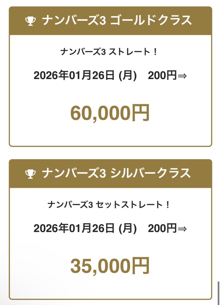 特に初心者でナンバーズ3ゴールドクラスは200ptから参加できるから、それで6万円も的中できたらかなり嬉しいよね!