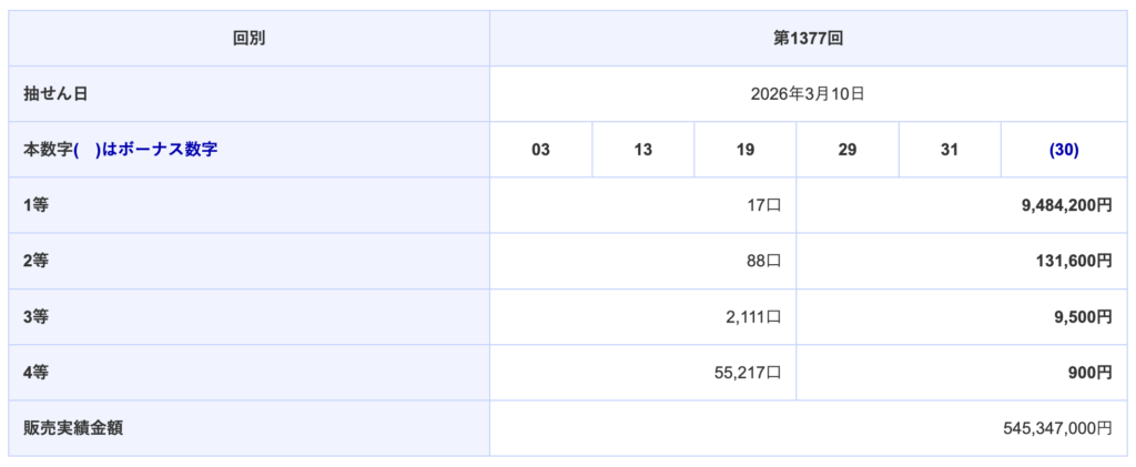 👇が最新回のミニロト結果だよ!